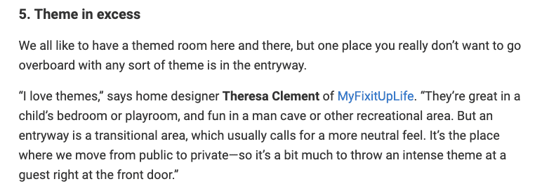 Still, there are some guidelines for creating spaces that please most of us. And Realtor.com gathered six of the common oops-moments made in foyers. My tip was #5 on their list. See below.