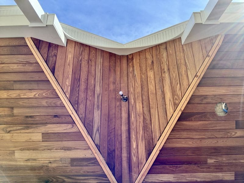 A wood plank porch ceiling warms up the vibe and creates a perfect transition between an interior and the outdoors. While you may think it’s just like installing a wood floor, there are a few reasons why it’s a whole lot more complicated. Plus, it’s all done on ladders and scaffolding. In this blog, we’ll get into some serious detail about installing this WoodPlank V-joint tongue and groove ceiling on our client’s new porch as a ceiling cladding.