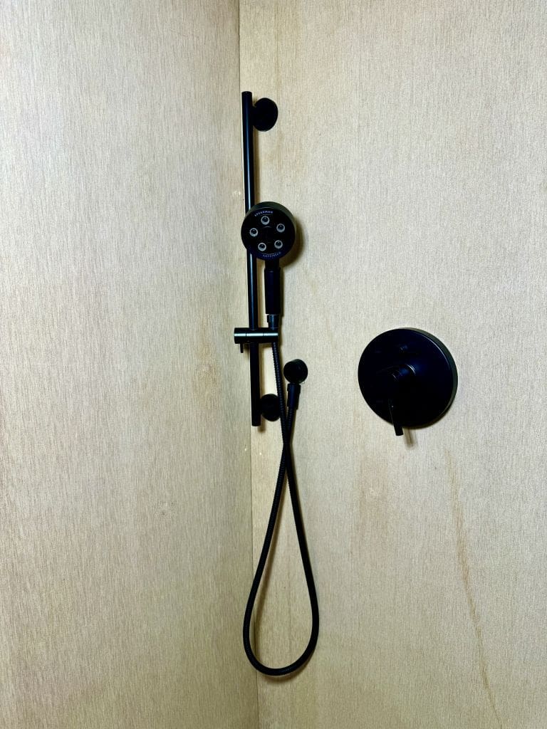 Solution: A hand shower under the soffit and a rain shower–what a glorious disc of matte black water diffusion–overhead.
