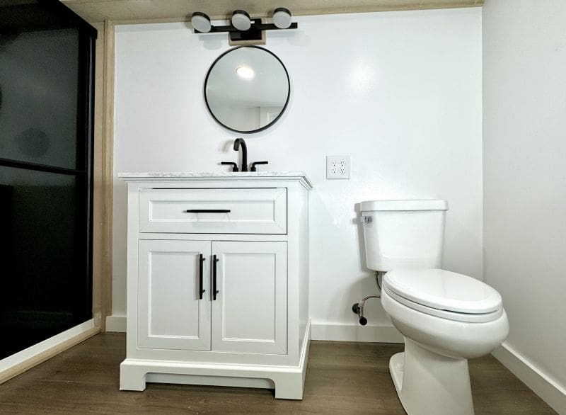 For a bathroom never meant to be there, one BIG detail is making sure the poo can roll downhill. The sink and toilet are no problem, but the shower is. Either the means of drainage–an ejection pump; we’ll cover this in another blog–needs to be lower than the shower or the shower needs to be higher than the pump.