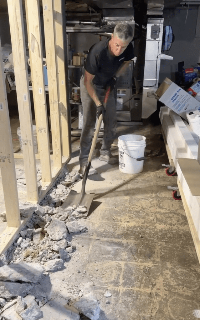 When I break up a slab like this, I find it cool that the last people to see this were construction people like me, only 75 years ago. I also find it very stressed having shovels and dirt inside. We need it and it is part of the process, but if you’re anything like me, untangle the landscaping tools from the carpentry tools as best you can.